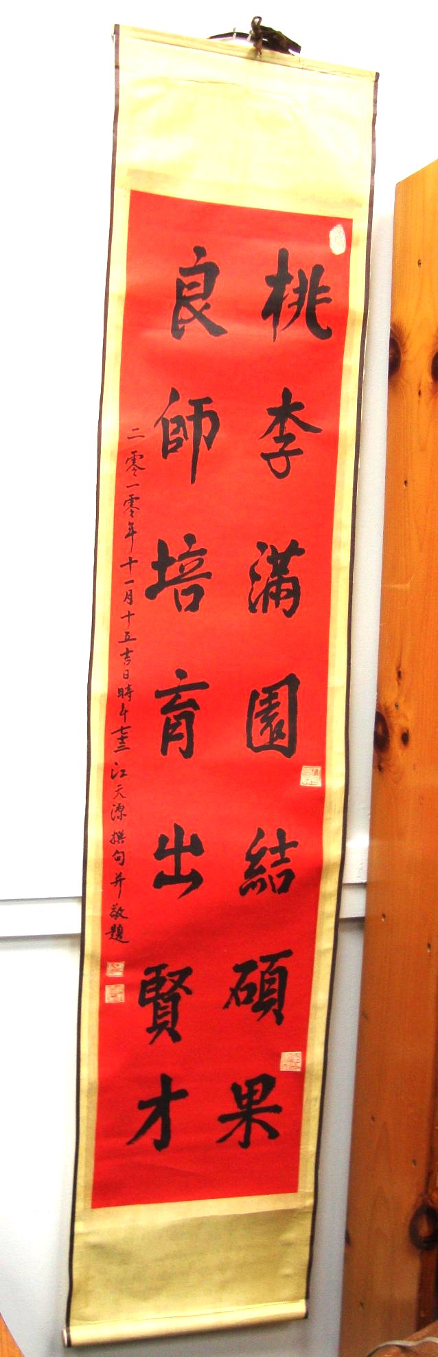 During his workshop-presentation, Mr. Jiang Tian wrote numerous signs for the audience and members of the Department of Foreign Languages. Among them is the sign at the right, which hangs in the department’s chairperson’s office and which reads: “Good teachers educate students to become highly qualified professionals. Your achievements are great.”