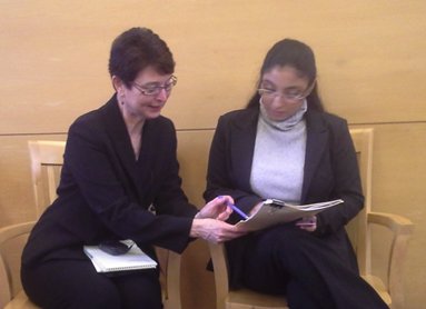 Constance Marina, Ph.D., Staff Interpreter II, OCIS and Katherine Palencia, intern, SPN385, at Chelsea District Court