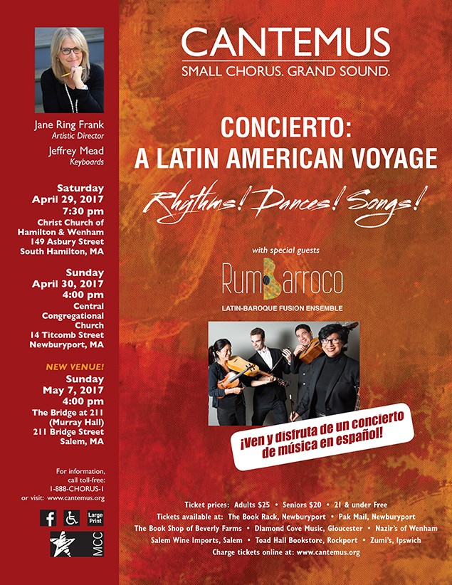 Concierto: A Latin American Voyage highlights contemporary music from Argentina, Puerto Rico and Venezuela, all of it performed in Spanish with special guest Rumbarroco, a professional Latin-Baroque fusion ensemble from Boston, directed by Laury Gutiérrez.
