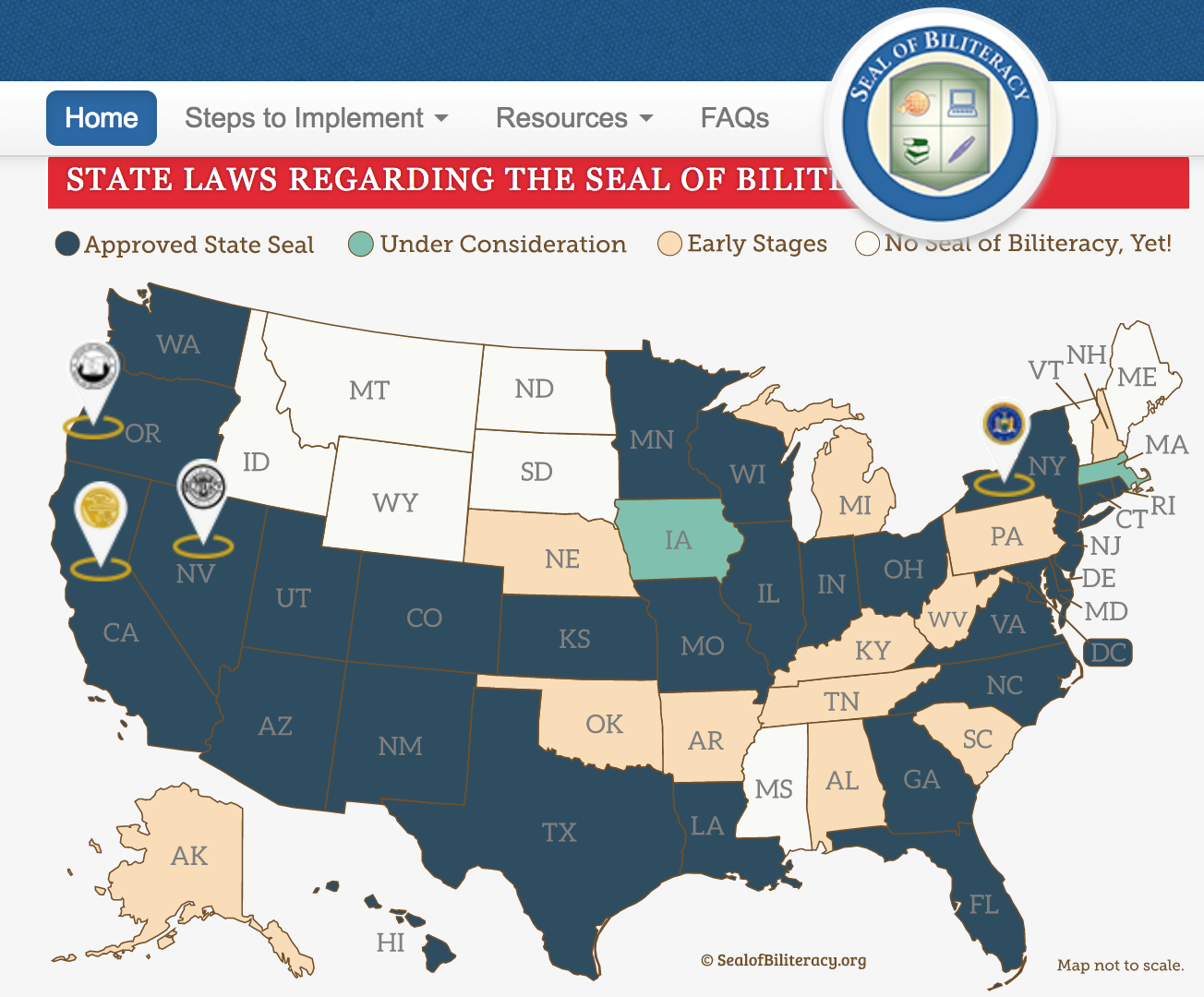 As I have described in Seal Updates over the past five years, the Seal of Biliteracy is a national movement to recognize students’ functional biliteracy in English and another language. Legislation has been enacted in 28 states and the District of Columbia since 2011, an amazing display of swiftness. In just eight years, we have watched the map which indicates the states that have enacted Seal legislation on www.sealofbiliteracy.org, get bluer and bluer as more states join the movement, denoting that they have “Approved the State Seal” or passed the legislation. Massachusetts has remained a frustrating light green for the past five years meaning that we have legislation in the state that is “Under Consideration,” but that is soon about to change!